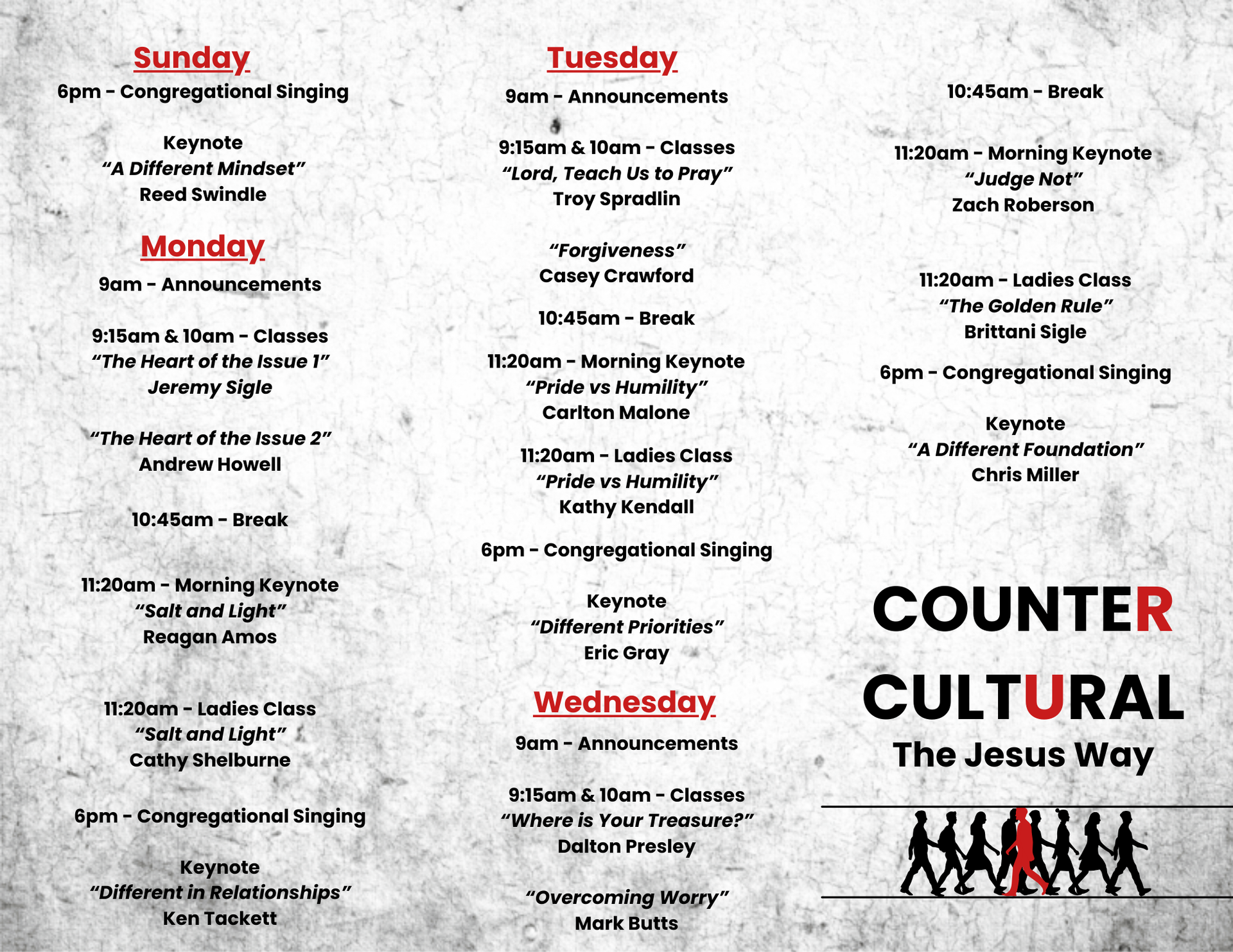 The Spiritual Enrichment Series is an annual lectureship series hosted by different congregations in the Mobile area. This year, Creekwood will be hosting the series from Feb. 22-25. Several speakers from the Mobile area and beyond will be with us to speak on the theme "Counter Cultural: The Jesus Way". Join us as we discuss how to be like Christ in this world! A schedule of the series is below.